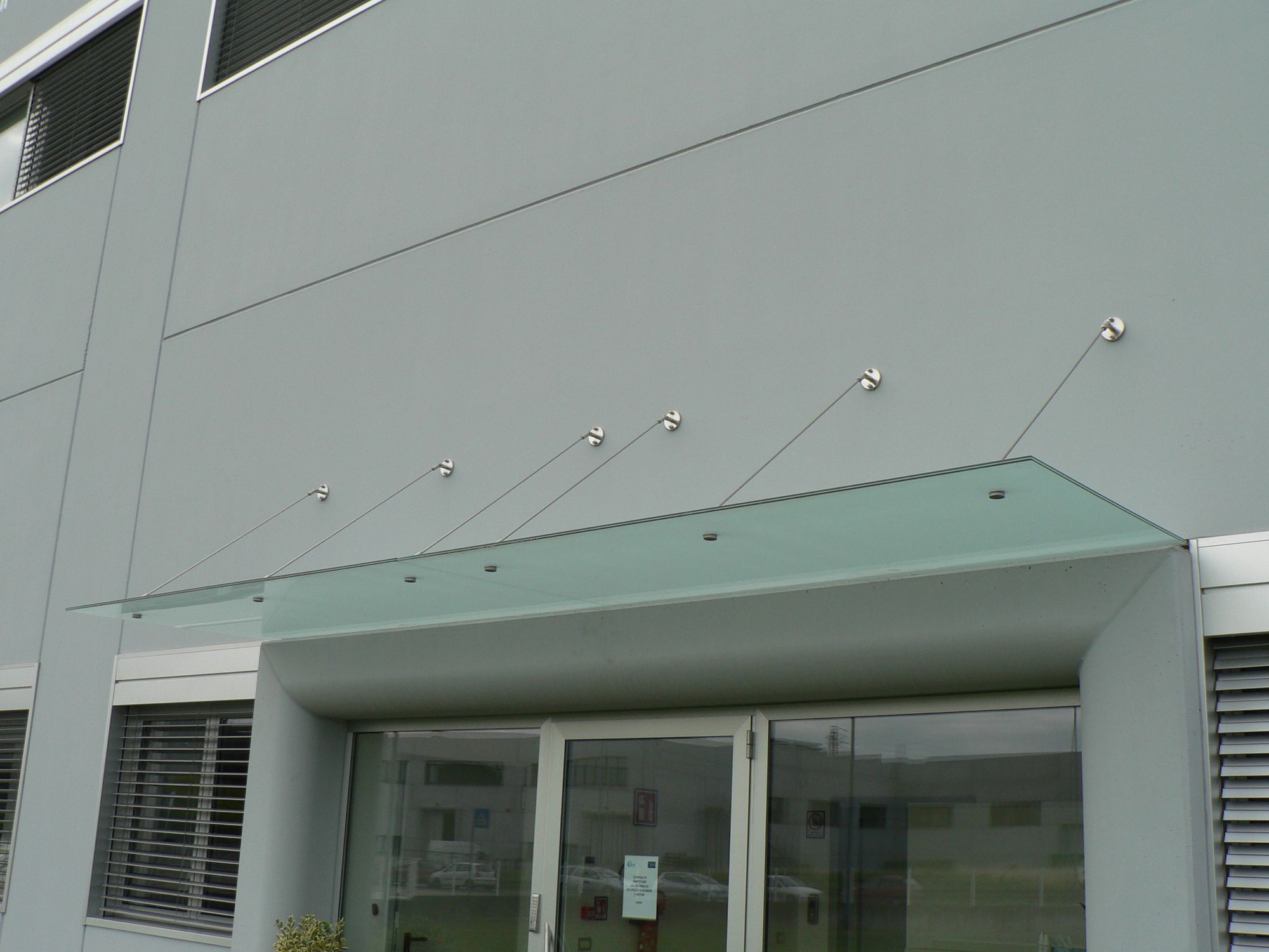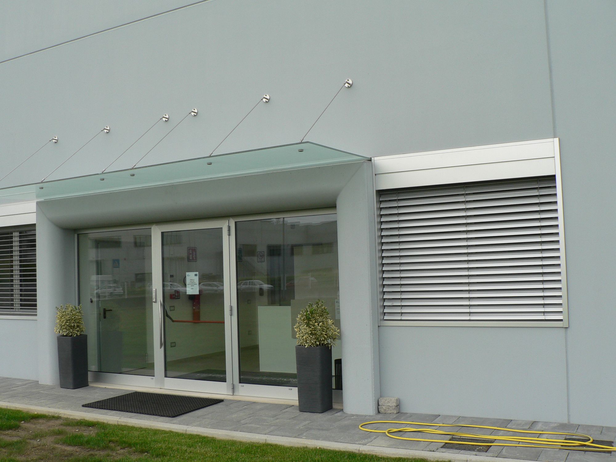 Pensilina vetrata 5500 x 1500 circa con vetro 8/8 e plastico opale, tiranti in acciaio Inox.